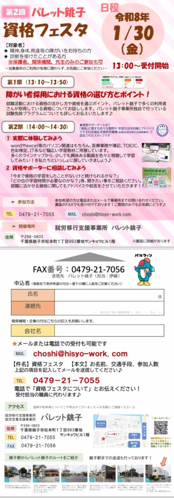 来年1月に開催される【就労移行支援パレット銚子★資格フェスタ】のおしらせです!