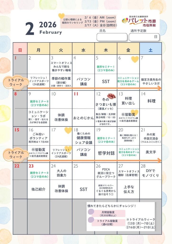 2月も、体力づくりや自己理解といった生活管理をする力を付けるものから、コミュニケーション力や社会人マナー等、働く上で必要な力を鍛えるものまで、幅広くプログラムを用意しています。