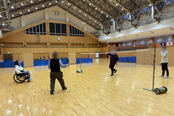 武道館でバドミントン・ボッチャ・卓球などを楽しみます。無理のない運動を通して、区分転換や交流を深めるプログラムです。
