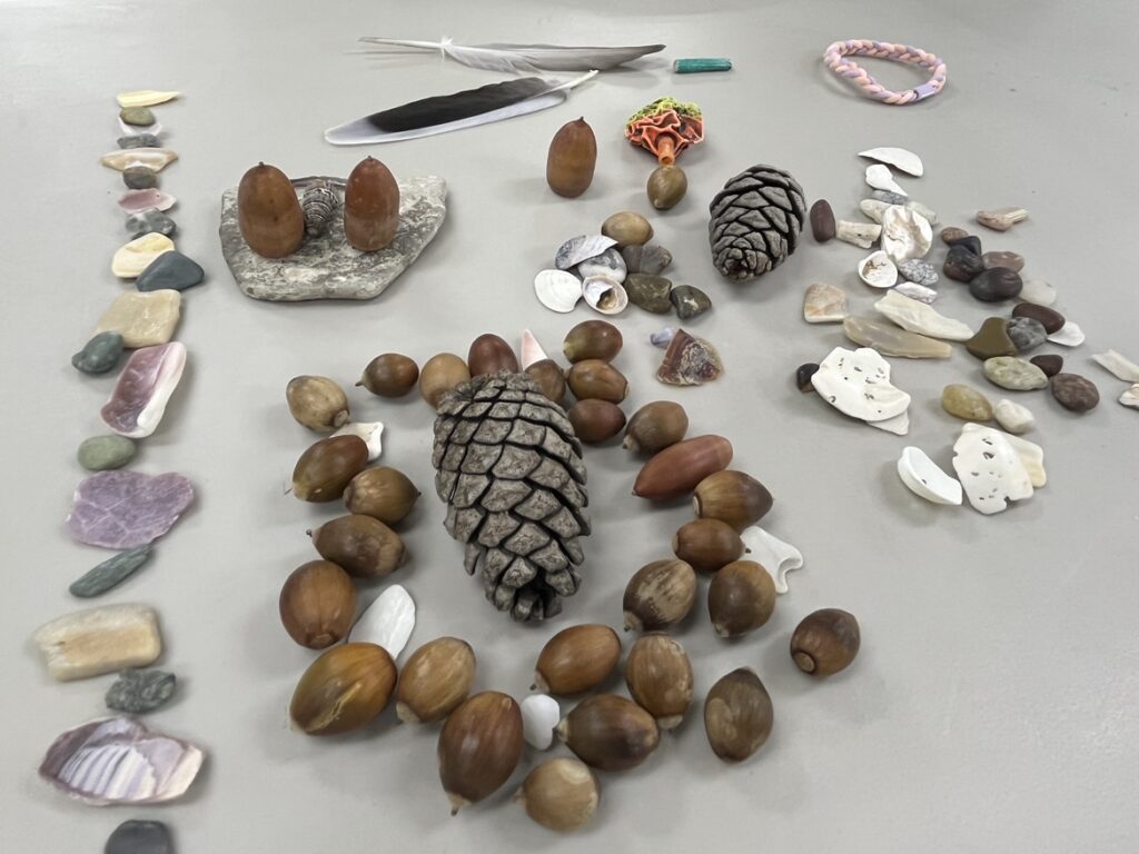 この時計が完成するまでのプロセスですが、まず、運動プログラムで稲毛海岸までウオーキングをし、稲毛海岸や公園で目にとまった貝殻や石を拾ってきました。
