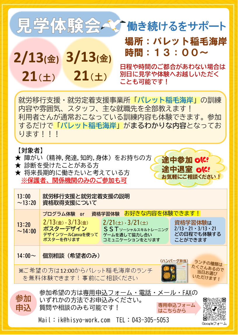 実際に来所して頂き、パレット稲毛海岸・銚子・市原市役所前の雰囲気を見てもらったり、お話を伺わせて頂きます。