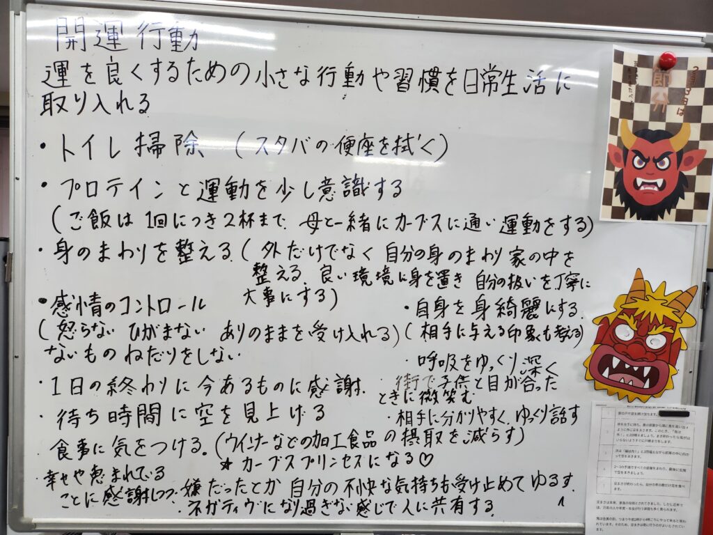 みんなで豆を巻き、お掃除をして場を整えた後に、今の自分ができる開運行動について、