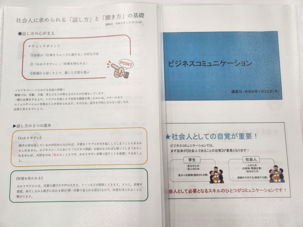 【ビジネスコミュニケーション】と【社会人に求められる「話し方」「聞き方」の基礎】の資料をもらいました。